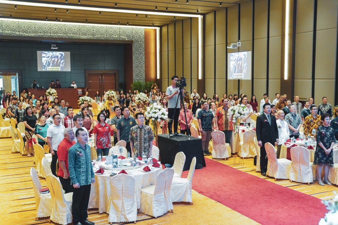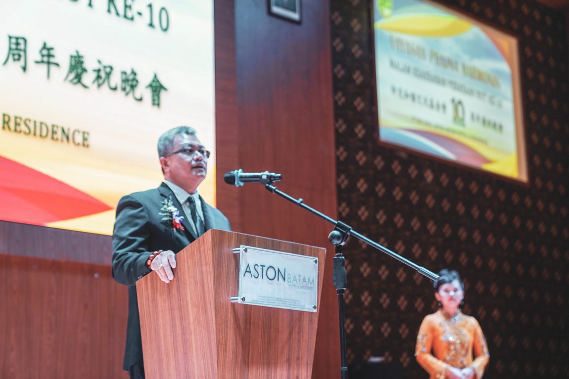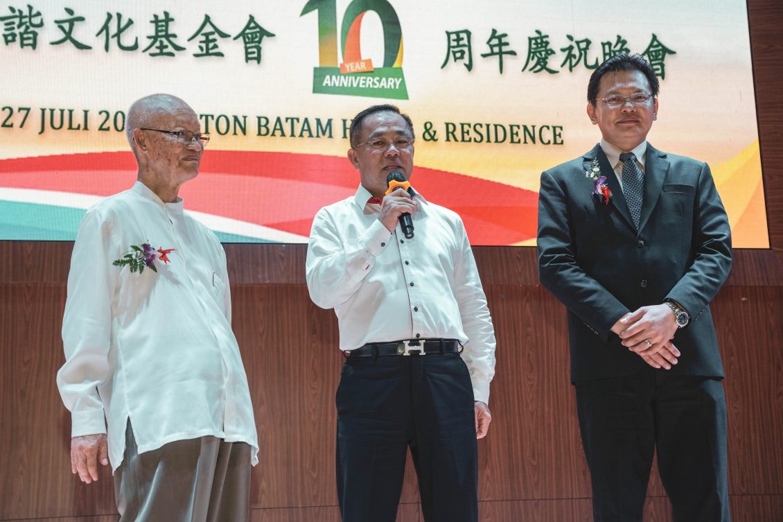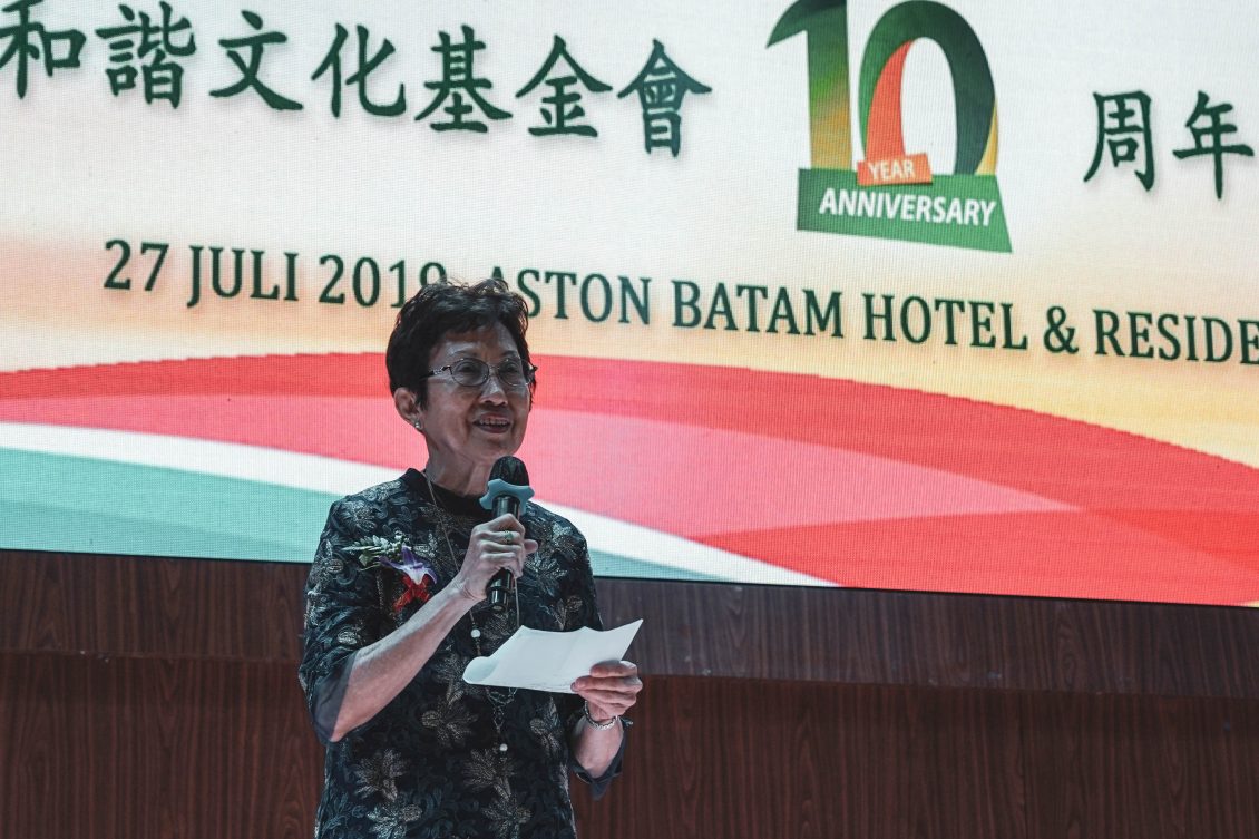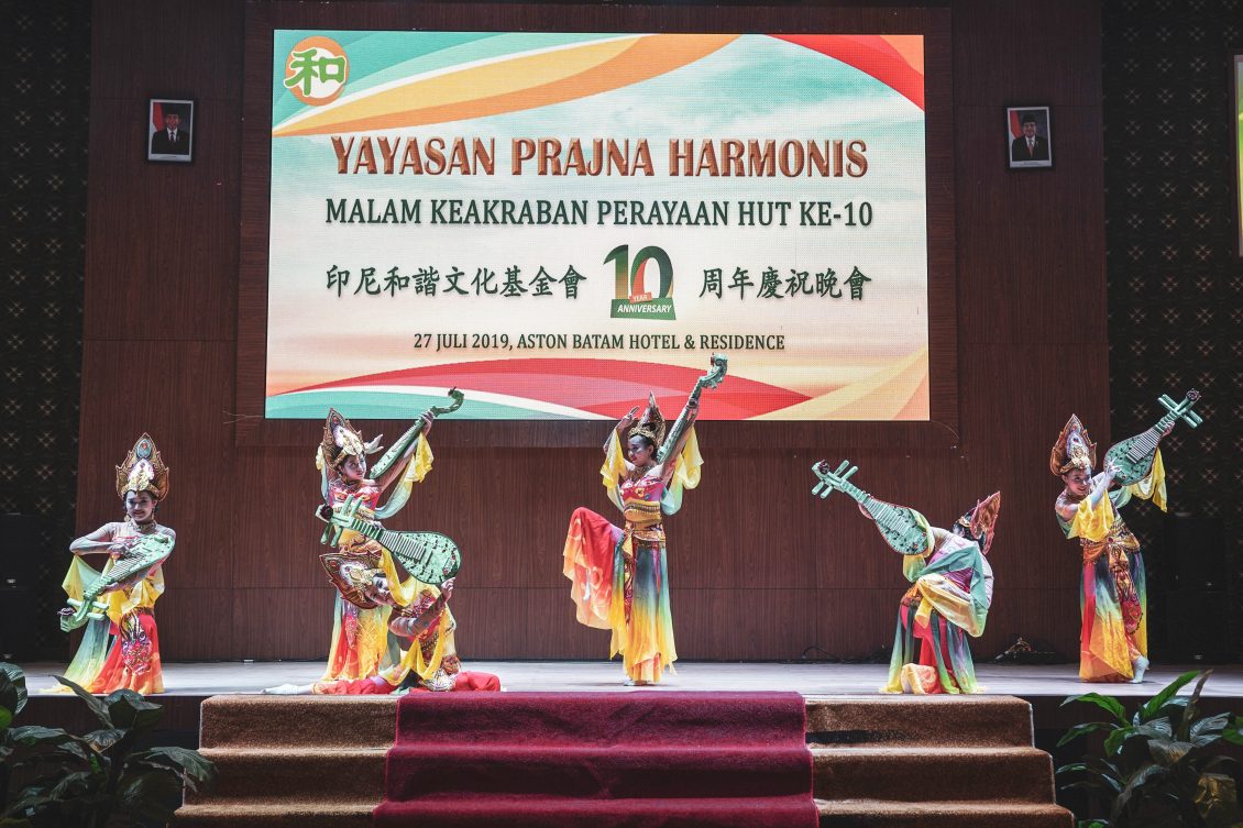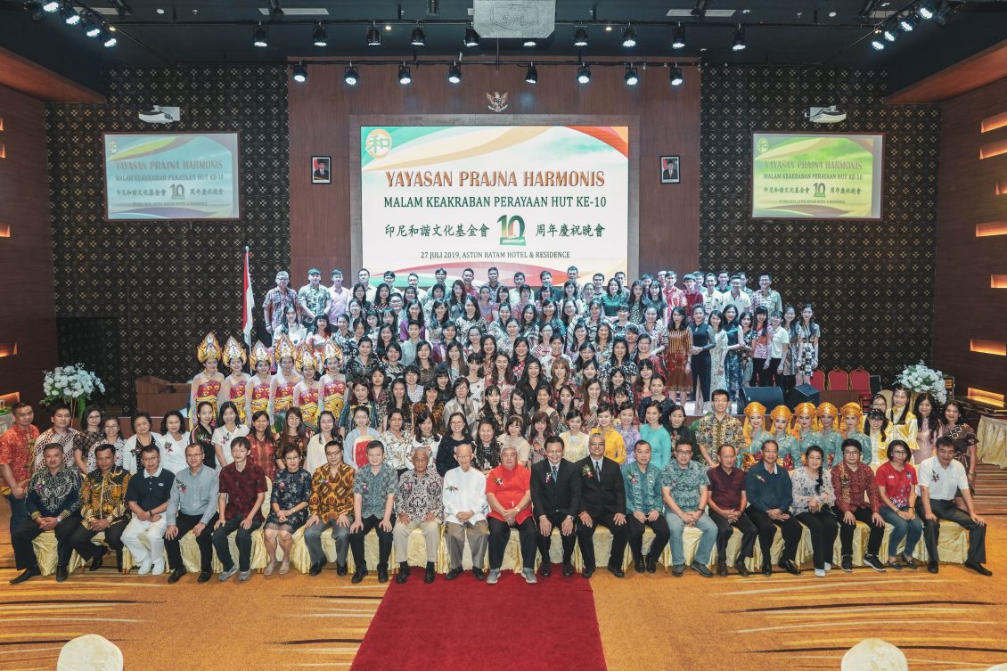 2019年7月27日傍晚,印尼和谐文化基金会十周年庆典晚会在巴淡市Aston Hotel大酒店顺利举行。中国广州暨南大学华文学院莫海斌博士、副院长;王衍军博士、教授、院长助理;印尼印华百家姓协会符德应总秘书长兼印尼和谐文化基金会名誉会长;印尼和谐文化基金会陈朝明会长(发起人)、黄愿字会长、李春广名誉会长、苏泳漳名誉会长;黄瑞兴名誉会长代表、郑仕雅名誉会长代表;印尼华文教育联合总会郑洁珊主席;印尼华裔总会廖群岛省分会陈建源主席;印尼世界大学校长Bapak Dr.Kisdarjono;弥勒学校教育基金会张圣佳会长和李田桑理事长;印尼李氏宗亲李国强总主席;台湾佛教慈济基金会印尼分会巴淡岛联络处代表,以及诸位暨南大学华文学院教授、社会贤达和200余名暨南大学华文学院巴淡、北干巴鲁、巴厘岛教学点的校友与同学来到晚会现场参与庆祝活动。