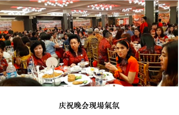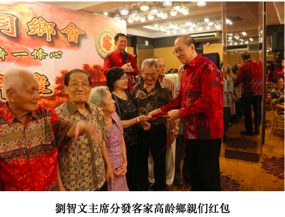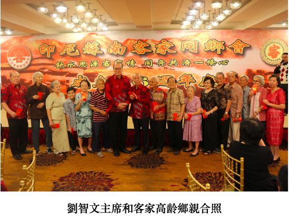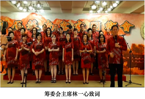 首先由筹委会主席林一心凖備工作和晚会程序报告,接下来是演唱客家会歌,全場起立热烈的鼓掌,然后由巨港苏南客家同鄉会主席劉智文致词,劉主席表示感谢各位貴宾和客家鄉親的光臨外,又賜厚儀祝賀,接下来是由劉主席分發给 80 以上高龄的客家鄉親,祝他们身体健康。
