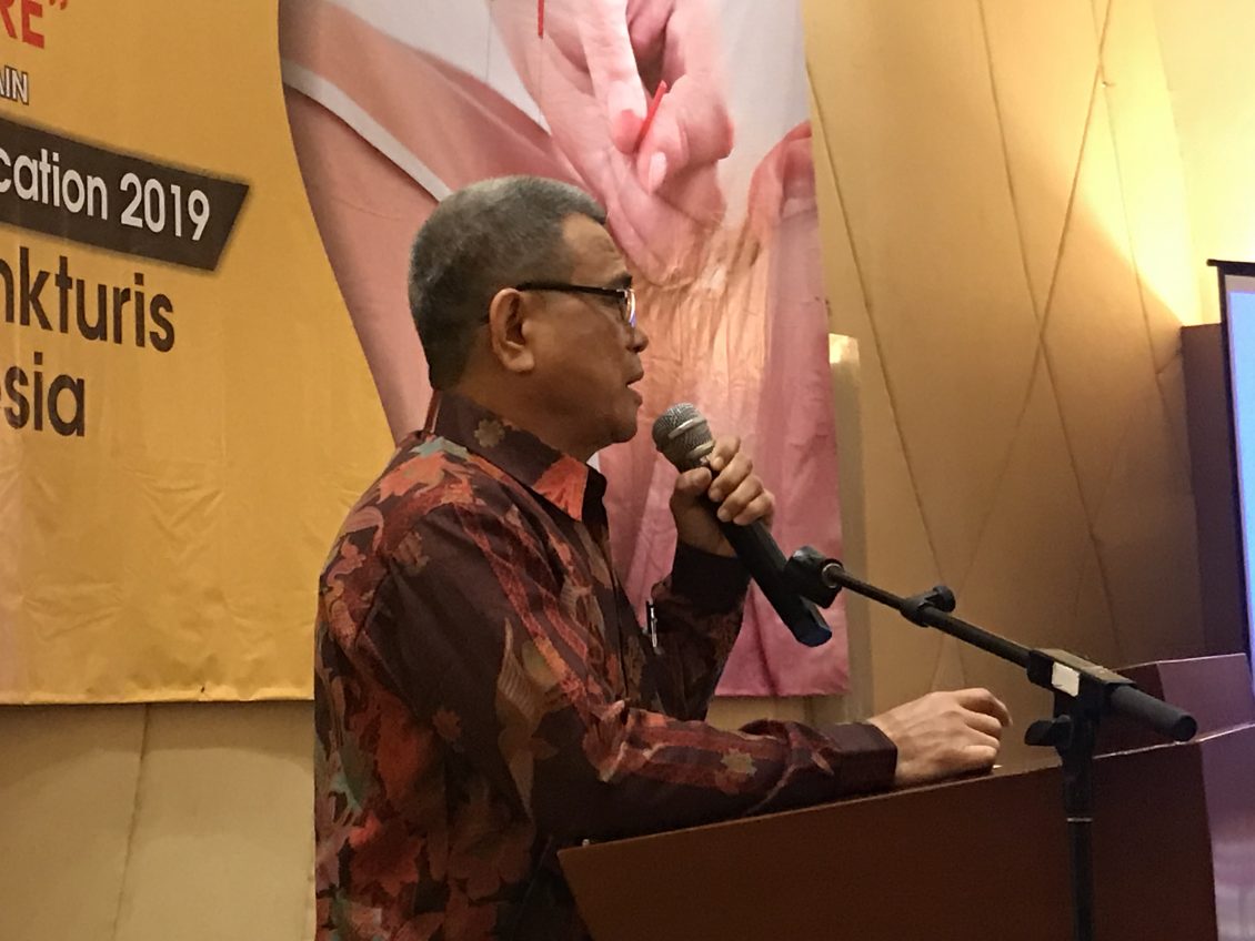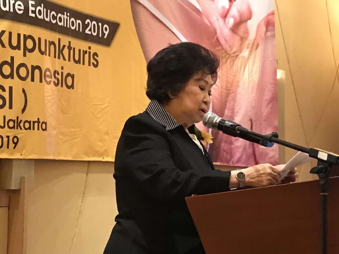 印尼全国针灸协会总主席曾缙云在讲话中,感谢大家的信任和期望。印尼针灸协会自1996年加入了世界针灸协会大家庭,成为该协会的一成员,从此世界认识了我们,我们也走向世界,自从103号法令诞生后,政府要求针灸师们要拥有本科文凭(D3).世界针灸联合会也接受这一措施,以加强针灸师们的资深学历。我自己通过本身的努力,自]1963年至1973年,在印尼中央医院开了针灸门诊,也可以说针灸在中央医院的创办人。她最后通知大家世界针灸大会将于2020年在土耳其举行,