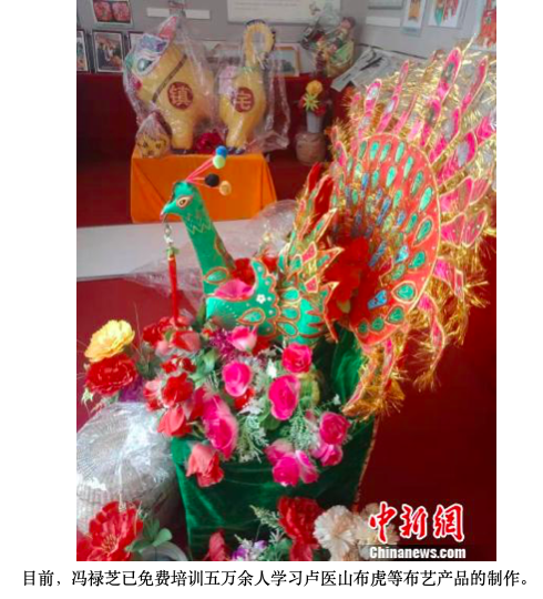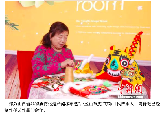 作为山西省非物质物化遗产潞城布艺“卢医山布虎”的第四代传承人,冯禄芝已经制作布老虎等布艺作品30余年。现在,冯禄芝创新的布艺产品有100多种,在她的努力下,这些产品远销韩国、加拿大、澳大利亚等地。