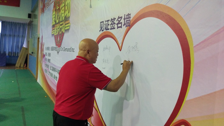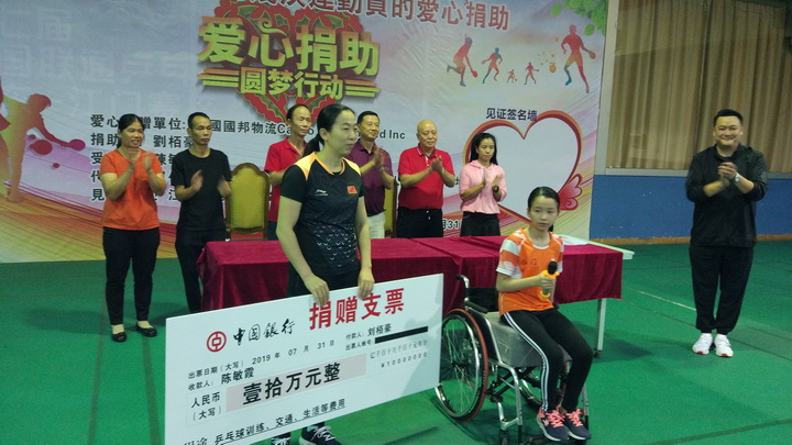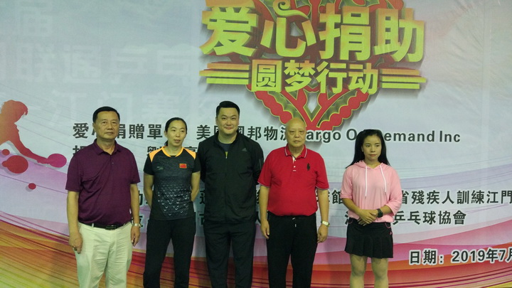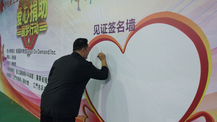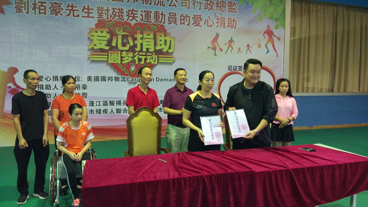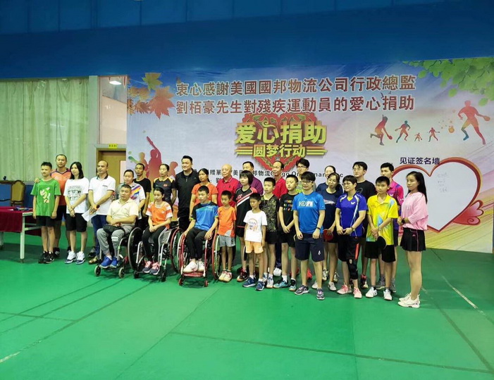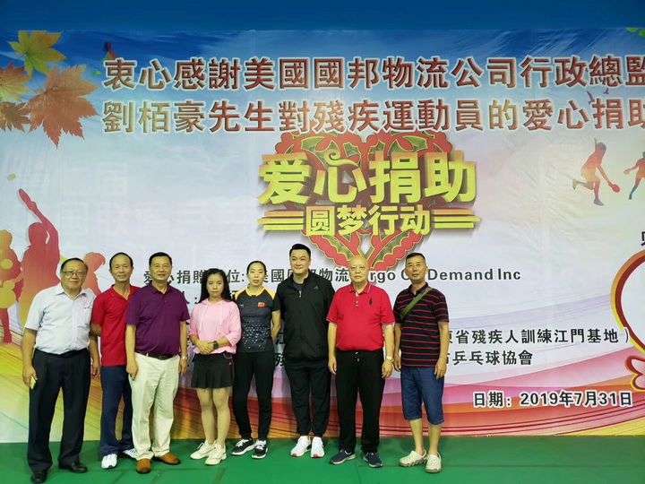 爱心捐助人 美国国邦物流公司(Gargo On Demand Inc)刘栢豪总裁(Pat Lau CEO)是一位成功的企业家、也是一位乐善好施的慈善家。多年来他通过『国际世界宣明会』(World Vision)捐助了十几位非洲的受助人。当他通过江门市乒乓球协会黄安麒会长获知在蓬江区骏扬乒乓球馆(也是广东省残疾人乒乓球训练基地)训练的广东省残疾人乒乓球轮椅运动员陈敏霞学习刻苦成绩好、打球特别能吃苦、品行优秀,是一位很有发展前景的运动员。但由于她家庭生活比较困难,不能长期安排训练。刘栢豪先生就此特意捐助陈敏霞的乒乓球训练、交通、生活等费用每年50000元、两年共100000元人民币,以帮助她成长为一个残而不废、有理想有追求的人。刘栢豪先生开心地说:“这是我第一次在中国做的捐助活动,希望以后能多做一些。”在场人士对刘栢豪先生的这次善举都伸出拇指点赞!江门市残疾人联合会、江门市乒乓球协会、受助人陈敏霞和她父母也一再向他表示衷心感谢!