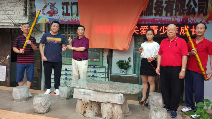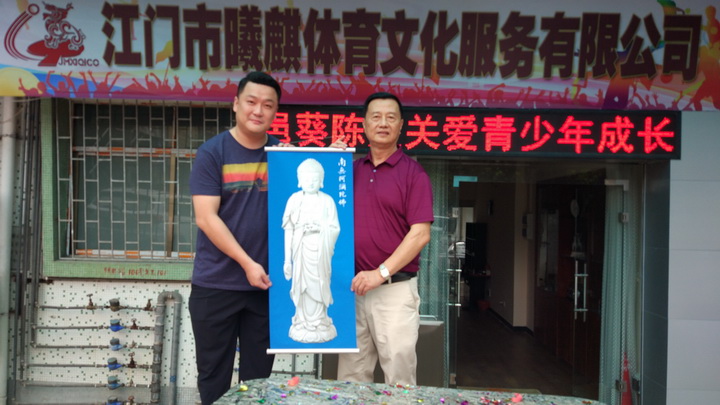 爱心捐助仪式之前,美国国邦物流公司刘栢豪总裁应邀出席了江门市曦麒体育文化服务有限公司挂牌仪式,与黄安麒、梅阳曦、蔡炳强、岑泽强、黄细麒一起共同为公司揭牌,刘栢豪总裁还向黄安麒赠送了佛像挂幅,并向公司开张表示衷心地祝贺!祝福江门市曦麒体育文化服务有限公司开张大吉!财源广进!