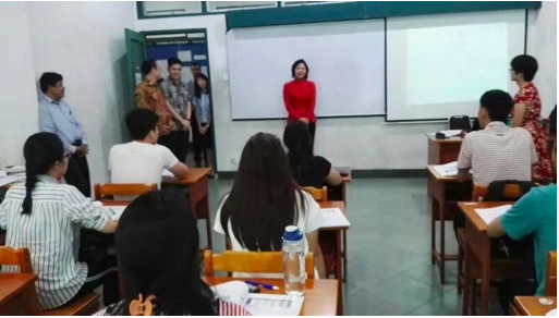 在观摩亚院中文班授课时,邱总领事勉励学生努力学好中文,做中印尼友好的使者。