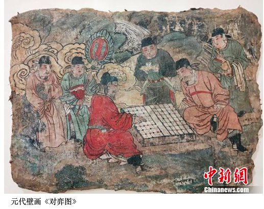 同样现存于山西省洪洞县广胜寺水神庙的元代壁画《对弈图》,画中的古代棋具、棋盘似现代象棋的“楚汉分界”,而棋子又类似现代的围棋,是研究中国棋类发展和演变的重要图示资料。