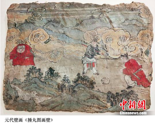 中新网太原8月6日电 (杨佩佩)绘有600余年前体育元素的山西古代壁画,6日在山西太原美术馆展出。其中,现存于山西省洪洞县广胜寺水神庙的元代壁画《捶丸图画壁》,呈现出的“捶丸”与“高尔夫”极为相似。