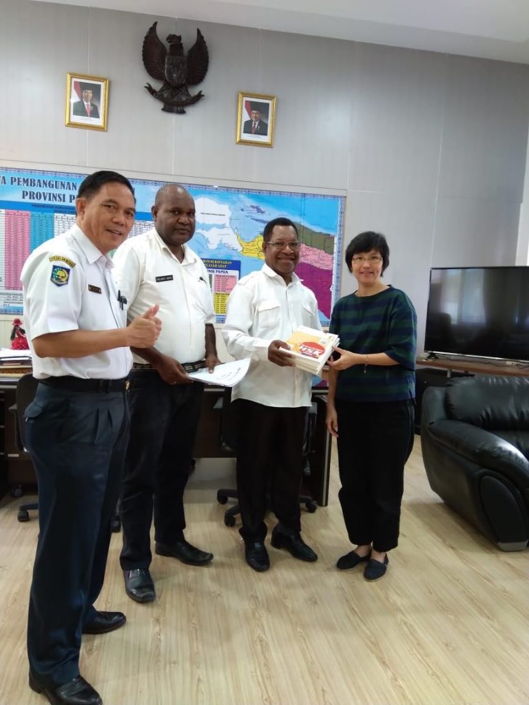 第二天余文琼与巴布亚省教育厅厅长就双方的合作进行了深入的交谈。出席此次座谈会的有:巴布亚省教育厅厅长ELIAS WONDA ,巴布亚省教育厅中专辅导部主任Yulianus Kuayo,巴布亚省教育厅中专课程处处长Drs.Maks Karu。余文琼首先代表雅协感谢今年上半年中国驻印尼大使馆周斌参赞一行率雅协团队不辞辛劳的来到巴布亚了解华文教育情况,中国驻印尼大使馆通过奖学金等项目支持巴布亚的华文教育发展。另外在大使馆的关心和支持下,在巴布亚省政府的努力下,雅协与巴布亚省政府建立起合作。雅协非常高兴的看到巴布亚已通过华文教师培训等项目提高教师的综合教学能力。余文琼并对雅协的基本情况做了详细的介绍,并详细的介绍了雅协正在进行的项目,包括教师培训、汉语桥、少儿绘画比赛等,并赠予了巴布亚省教育厅HSK教材。ELIAS WONDA 厅长表示希望能够与雅协合作师资培训,希望能够提高巴布亚的汉语师资力量。巴布亚今年有三个学生获得了中国政府的奖学金,非常感谢中国驻印尼大使馆让他们有机会去中国留学,巴布亚还有很多学生希望能够去中国留学,希望能继续得到大使馆的支持,明年巴布亚可以有更多的学生获得留学的机会。ELIAS WONDA 表示巴布亚也希望能够举办汉语桥比赛,希望下一届的汉语桥比赛能够邀请他们观摩。另外ELIAS WONDA 厅长表示非常希望能有机会也在巴布亚举行少儿绘画比赛。