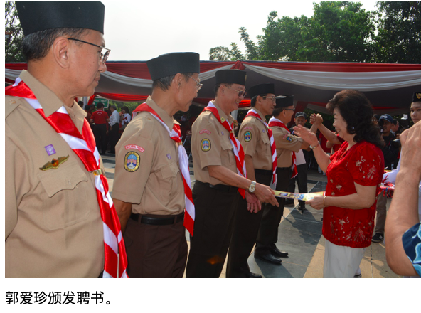 (本报讯)于8月17日(周日)早上10时,在TMII印尼华人文化公园举行的我国建国74周年升旗礼结束后,必利达学校(SekolahPelita)在现场特向陈社栋,周沅瑶,罗秉光、刘新华、蔡镇伟五位雅加达印华百家姓协会理事颁发了该校童子军运动2019-2021年度辅导主席团聘书。聘书由必利达学校校长郭爱珍颁发,校董饶兴生则逐一为他们佩戴童子军运动徽章。
