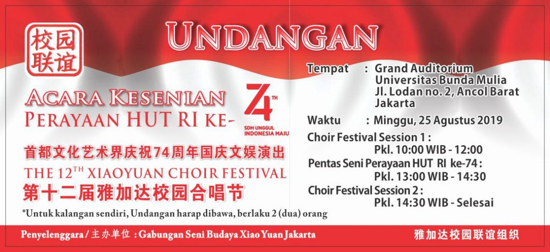 (本报讯)首都文化艺术界暨雅加达校园联谊组织定于2019年8月25日(星期日)在慈育大学8 楼大厅举办庆祝74週年国庆文娱演出及第十二届雅加达校园合唱节。即时将有23个合唱团参加演出。