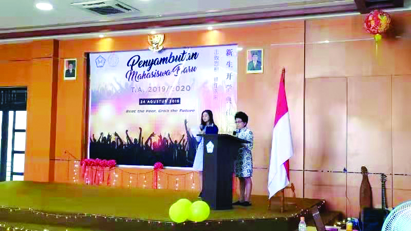两位漂亮的女同学苏美璇和叶晓婷是今天的司仪。文光老师带领大家进行祷告后,全体起立颂唱印尼国歌,然后20位同学上台合唱共同希望语言学院校歌,迎新会拉开了帷幕。眯者院长首先热情致辞,向2019级新生致以衷心的祝贺和热烈欢迎。眯者院长还向大家一一介绍了共同希望语言学院的全体老师。