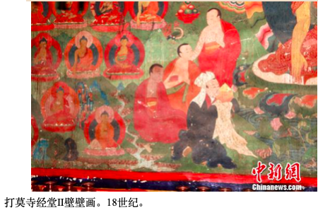 据了解,甘孜州白玉县有多教派共荣共存的传统,其中宁玛派、萨迦派、本教等寺庙遗存数量较多,此次考察的寺庙包括昌台区安章寺、赠科乡打莫寺和达衣寺、麻绒乡扎嘎寺。特别值得一提的是,打莫寺,较为完好地保存了初建时期的壁画。罗文华介绍,这是目前为止甘孜州所发现的保存面积最大的古代壁画;根据壁画上的题记,可以准确地断代到18世纪初;壁画内容较为完整地表现了宁玛派尼扎大师伏藏传承十八种不共法的尊神体系,这是现存最早的图像实例;该寺壁画的艺术风格与德格印经院小护法殿现存18世纪的壁画极为相近,明显属于德格土司主流风格的作品;但是又有创新,汉藏艺术结合得更加自然、流畅,令人耳目一新。