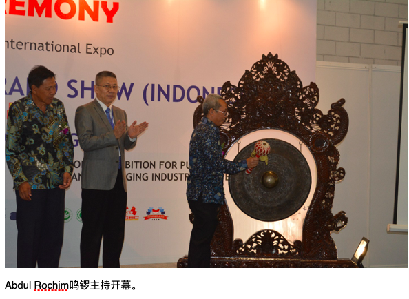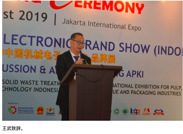 中国驻印尼大使馆王立平公参、印尼工业部Abdul Rochim总干事、印尼纸浆和造纸协会Aryan WargaDalam 主席、中国机电产品进出口商会张晶副秘书长、中国化工信息有限公司王武总经理出席开幕式并致辞。商务部外贸发展局、山东省商务厅、中国环境保护产业协会、江苏汇鸿国际集团股份有限公司、印尼数字印刷协会、印尼金属及机电产业联合会代表出席开幕式。