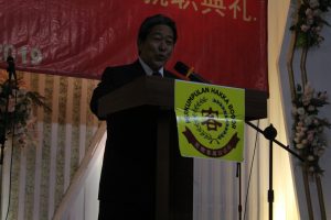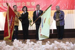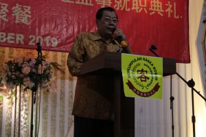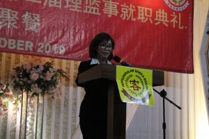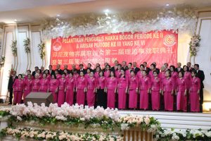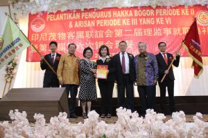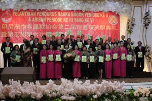 新届主席叶辉云致词除表感谢大家的热烈出席。也甚表对叶正欣和熊国存的逝世表示痛失。讲述茂物客属联谊会创立于2013年,在他们领导下,公会买下了会所,组织了歌咏团、乒乓球队以及为诸多社会公益事业的贡献等等。她希望青年组引进更多会员,更望得到印尼客联总会的指引,能为社会尤其是华社做出更多贡献。