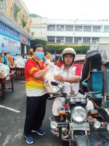 在此同时, 在先达进行的爱心活动, 先达客属分会副主席陈庆发代表未能出席的叶选达主席,妇女部副主席李采玲,青年部主席叶爱琳及其他理事, 给当地贫民和三轮机动车车夫分发爱心粮包。