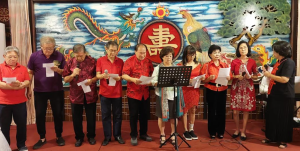 由队长曹宏德Tedi 夫妇和理监事,辅导丘国南,朱建真等队友亲临现场晚宴礼堂里, 大家欢乐独唱 ,合唱美好的春节歌曲,队友的团结精神感染每个人, 大家感恩能在龙年春节联欢晚会上共同庆祝佳节。