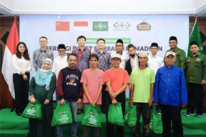周侃临时代办、穆萨法秘书长共同向印尼群众代表现场赠送了包括大米、白糖、食用油、面粉等生活必需品的斋月爱心包裹。
