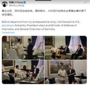 5月12日,陆慷大使在社交平台“X”(原推特)账户上发文说:“离任之际,同印尼当选