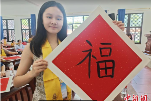 图为书法学习环节中,印尼华裔学生黄炜芳展示用毛笔写的汉字“福”。廖珍妹 摄此行成员包含10多位华裔中小学生、数名华裔华文老师,黄顺龙是其中一位老师。在他看来,此次交流将增强印尼华裔学生视野和对中华文化的理解。“印尼和中国在文化经济方面合作紧密,作为华文老师,期盼未来培养出更多汉语人才,为两国深化友谊与合作贡献力量。”