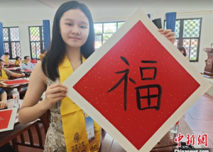 图为书法学习环节中,印尼华裔学生黄炜芳展示用毛笔写的汉字“福”。廖珍妹 摄