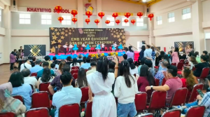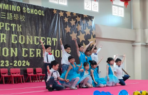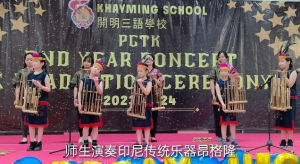 紧接着,開明三语学校唱游班、幼儿园和小学部学 生轮番登台带来精彩演出,其中师生一起演奏印尼传统 乐器昂格隆博得大家的阵阵掌声。节目间隙,泗水開明 民族希望基金会理事陈淑莲、尤榕官、吴萌暄等人向即 将回国的開明三语学校两位中国外派老师赵祝卿和曹芮 赠送纪念品,以感谢赵祝卿老师和曹芮老师在開明三语 学校支教。(AV/MK)