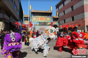 智利圣地亚哥唐人街首座牌坊揭牌仪式现场舞狮表演。受访者供图