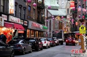资料图:随着春节的临近,美国纽约曼哈顿唐人街张灯结彩年味儿渐浓。图为街道上