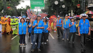 今日的万隆,从早上到傍晚就一直下雨,时大时小的雨没有浇灭万隆市民们的热情,亚非街那一带约上千人,人挤人,像蚂蚁一样的人都伸长了脖子想要看清楚那些游行的队伍。来自各地的队伍犹如八仙过海,各显神通,展显出各样不同到的节目,五彩缤纷的服装、舞姿、有可爱的、有趣诙谑的人物等等,让人目不暇给。主宾看台上坐了各国的使者代表,每当代表他们的节目,或者喜欢的人物经过时,都以热烈的掌声欢迎,现场十分热闹。