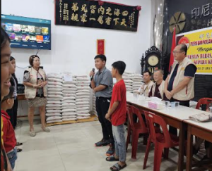 接着叶福强主席階同各位理事主持分发总共一顿半大米予 50个贫困家庭,每个家庭領取三包大米(每包10支罗),并分发医药费予12名年老多病乡亲 和分发助学金予15名学生,结束后叶福强主席和各位辅导与理事移玉到楼上会议室讨论会 务之各项事宜。(陈平治报道)