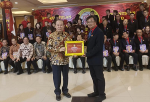 来自不同地区的客家领导赠送纪念品给北加浪岸客属主席。