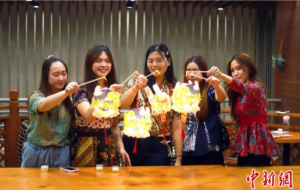 “很热闹、很有趣!”来自印尼的留学生露碧、吴菲菲和王嘉音穿着印尼民族服饰亲身体验做月饼。