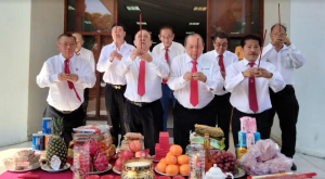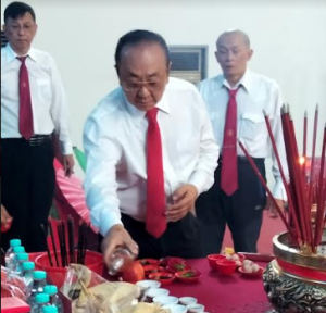 早10时,秋祭典礼开始。李氏宗亲会主席李振健宗长率领宗亲理事们先到会所大门摆设的香案前上香拜天公,祈求上天赐恩保佑苍生,赐风调雨顺,国泰民安。也到台上一隅祭拜土地公,祈求守护各家各户安宁、五谷丰登、财源广进。