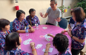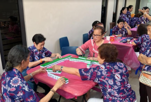 在室外,大家享用月饼和点心、拍合照,然后有的像小孩般在广场嬉闹;另一边,有的人在玩马来播棋(congklak),有的人在打纸牌,有的人在打麻将,大家都玩得不亦乐乎。