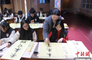 中心的32名华裔青少年,学习了书法课程。图为营员们学习书法。欧惠兰 摄