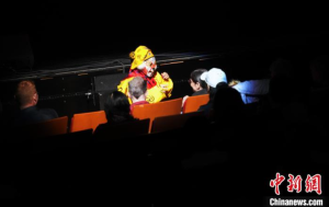 大法语区最大城市蒙特利尔举行。图为扮作孙悟空的演员在表演过程中与台下观众互动