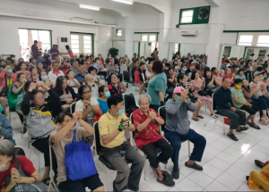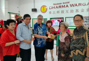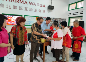 1月27日上午,泗水Algonz 教堂与Darmo Permai Selatan晨运组分别在鲁北乡亲互助基金会会所开展爱心活动 ,向会员们分发节日红包盒饭。