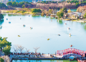 向游”的热门选择。阳光洒落湖面,一艘艘公园游船载着游客穿行于湖光山色之中,碧绿