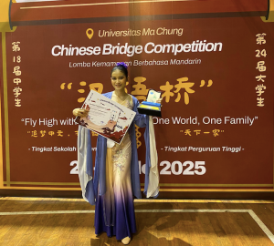【泗水讯】泗水国立大学(UNESA) 语言与艺术学院汉语教育专业的女大学生再次斩获佳绩。 英格拉莉丝·迪基塔·普拉梅斯瓦丽(Inggralies Dikita Prameswari) 在2025年5月23日至24日于玛琼大学(Ma Chung University,马琼大学,位于玛琅)举办的“汉语桥” 世界大学生中文比赛印尼赛区总决赛中荣获“最佳才艺表演奖”( 最佳才艺表演者)。
