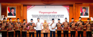 泗水,2025年10月14日—— 东爪哇省政府与印度尼西亚红十字会PMI联合在泗水国宾馆Ged ung Negara Grahadi举行仪式, 向604名累计献血75次的无偿献血者颁发“忠诚勋章荣誉证书” Piagam Penghargaan Satya Lencana。