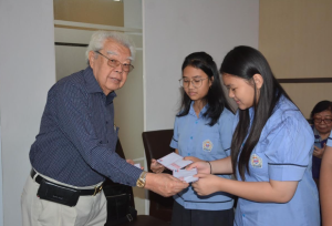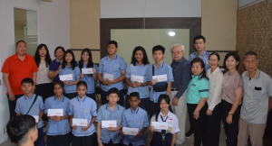 讲座结束后,活动进入奖助学金颁发环节。李汉雄辅导主席、 林端娘及李秀珍会长分别向11名初中生、 23名高中生和21名大学生颁发助学金。此外, 来自泗水中华医院高等护士学院的两位毕业生还特地向李汉雄辅导主 席递交了自己的毕业论文,以表达感恩之情。