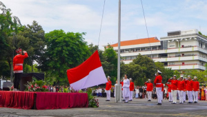 在升旗仪式上,泗水大学校长贝尼· 利安托宣读了印尼青年与体育部长的致辞, 强调青年团结与奋斗精神的重要性。